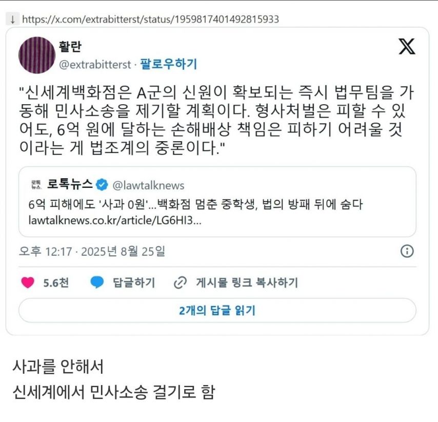 신세계백화점에 폭탄 설치했다고 한 중학생 근황